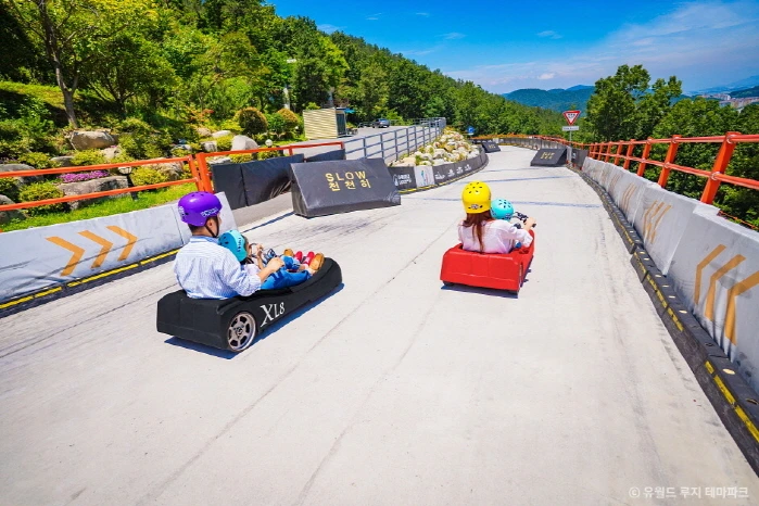 유월드 루지는 도심 속 초대형 1.3km의 트랙을 특수 제작된 무동력 카트를 타고 경사면을 따라 조성된 터널, 어트랙션 구간, 스카이브리지 활강구간, 자연숲구간 등 다양하고 박진감 넘치는 트랙을 중력만을 이용해 내려오는 체험활동으로 남녀노소 누구나 스릴을 즐길 수 있다. (자료출처 : 대한민국 구석구석 - korean.visitkorea.or.kr) 위치 : 펜션에서 차량으로 약 24분, 14.7km